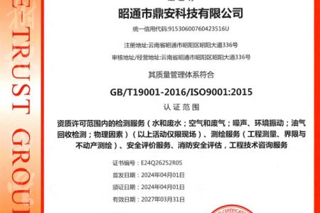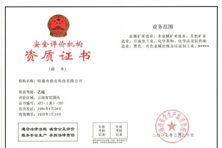 2003年11月10日,昭通市鼎安科技有限公司成立,初始主要從事第三方安全工程技術服務,經(jīng)多年運營,發(fā)展為多專業(yè)綜合科技平臺,為社會提供多種專業(yè)技術服務工作。 現(xiàn)公司注冊資金為1200萬元,公司法定代表人:毛衛(wèi)旭。公司主要業(yè)務:安全評價、安全標準化評審、安全工程技術服務;環(huán)境監(jiān)測、職業(yè)衛(wèi)生檢測、檢驗;法律訴訟及非訴訟服務;司法鑒定、固定資產(chǎn)投資項目節(jié)能服務;工程咨詢;工程測量測繪;安全教育培訓等。是安全生產(chǎn)服務、安全教育培訓機構,也是環(huán)境監(jiān)測和職業(yè)衛(wèi)生服務機構,同時也是綜合的檢測檢驗、綜合科技平臺服務機構。多年來為公、檢、法、司、軍、警、海關、仲裁、安監(jiān)、工礦商貿(mào)企業(yè)、社會團體及個人提供多專業(yè)技術服務。